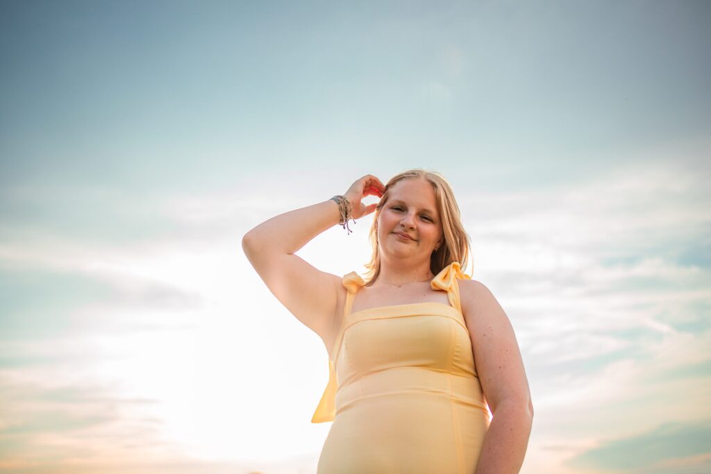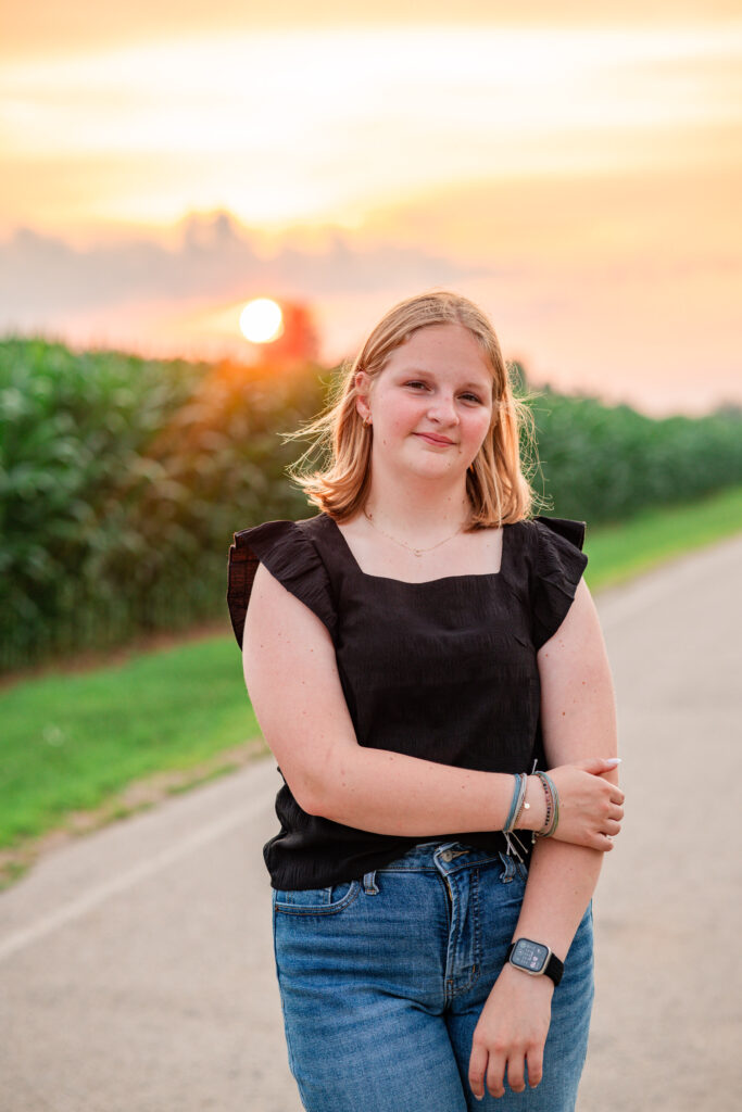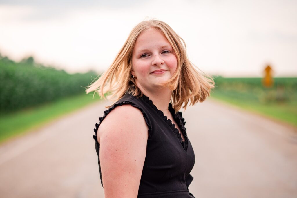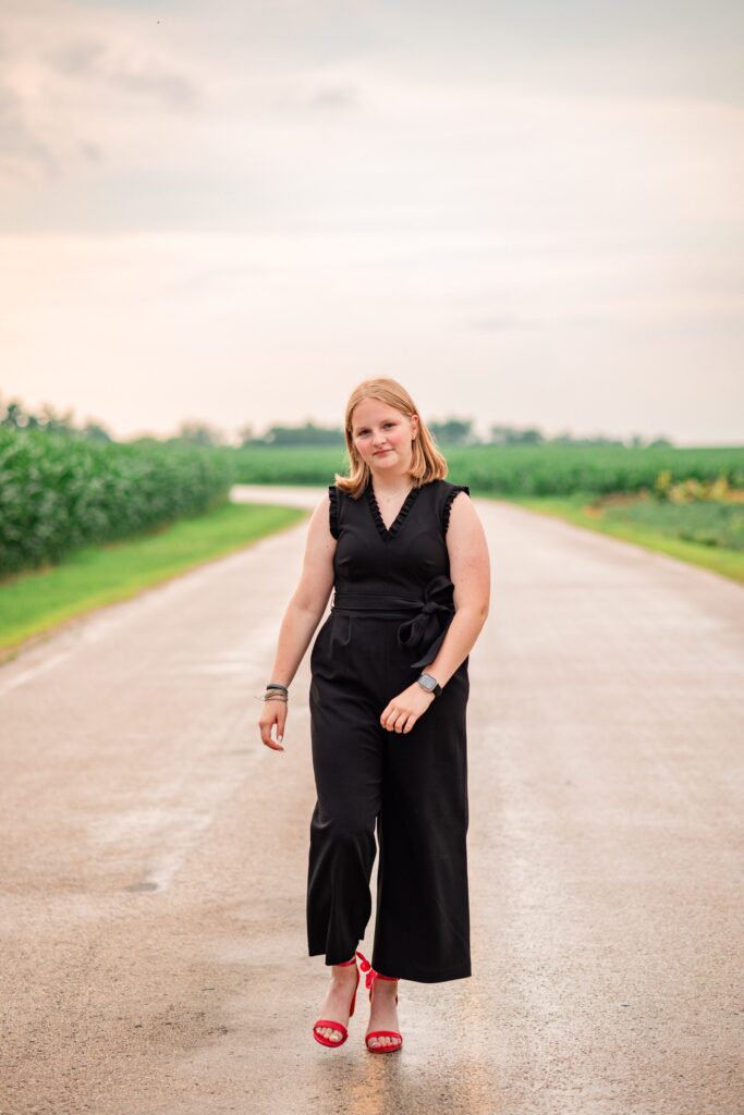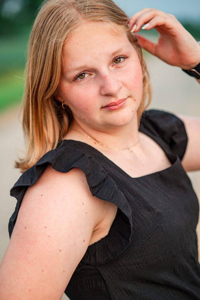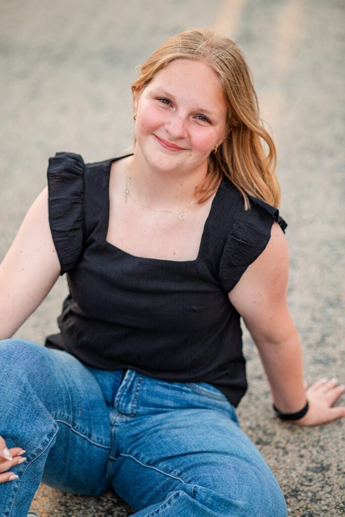 Camryn began her session walking down a quiet gravel road. The leftover puddles reflected her in the soft light, adding depth and calm to the images.