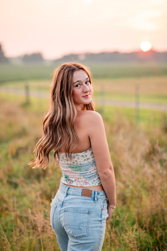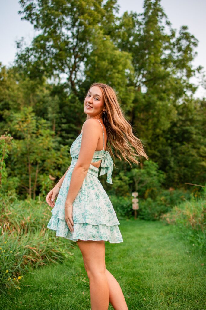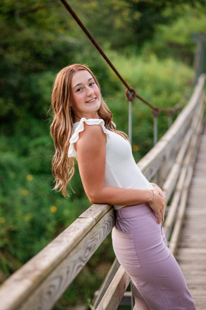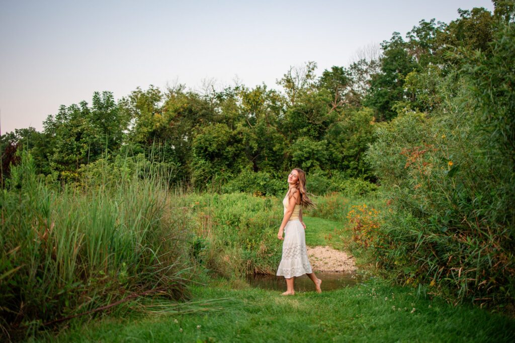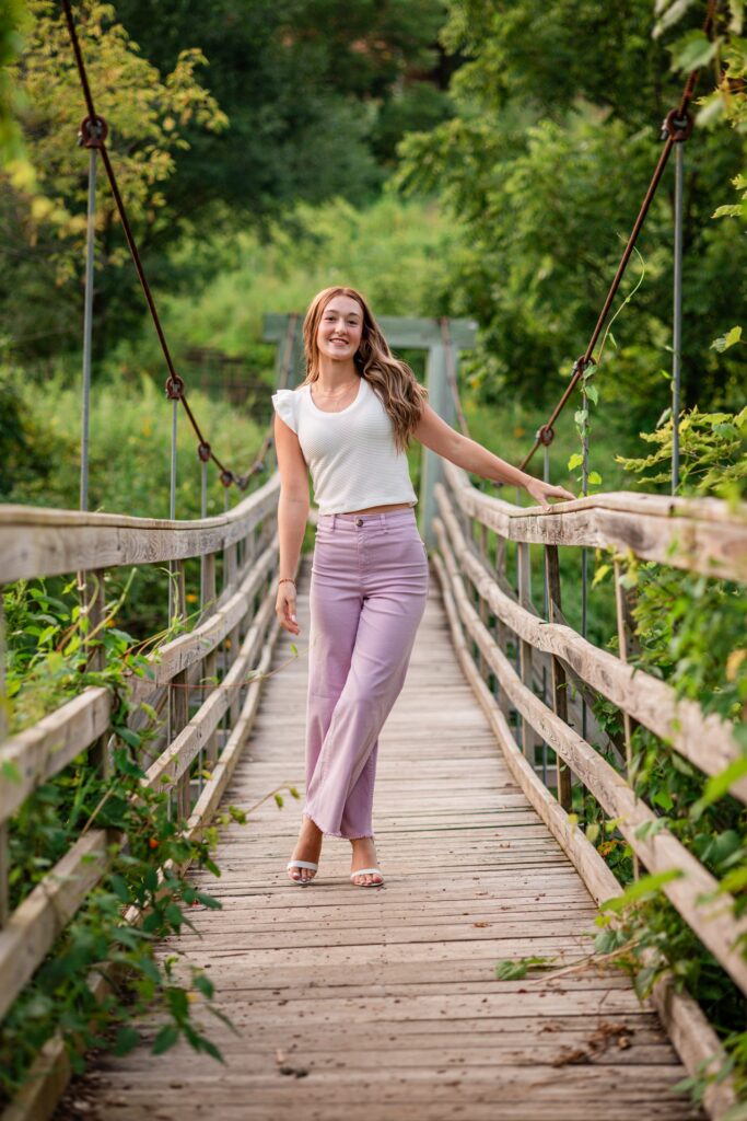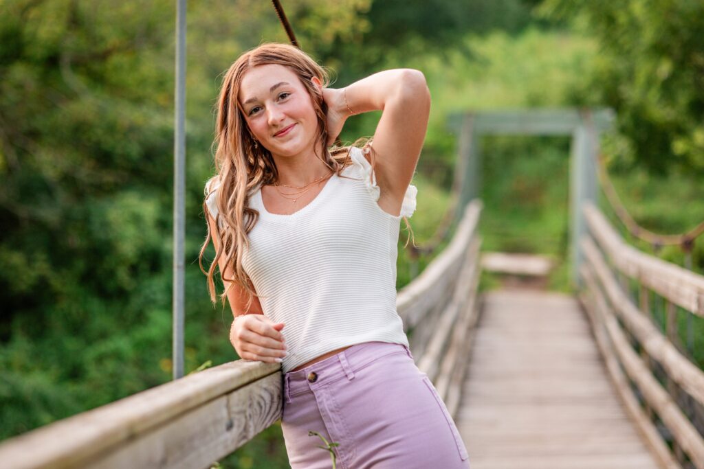 When she described that bridge, I knew immediately. Swiss Valley Nature Preserve in Dubuque, Iowa. Wooden bridge, creek, tall grasses, trees, soft late-summer light. I’d photographed there before, but never for senior pictures. When I told her that, she was in. She wanted a location that felt like hers, and that’s exactly what this gave her.