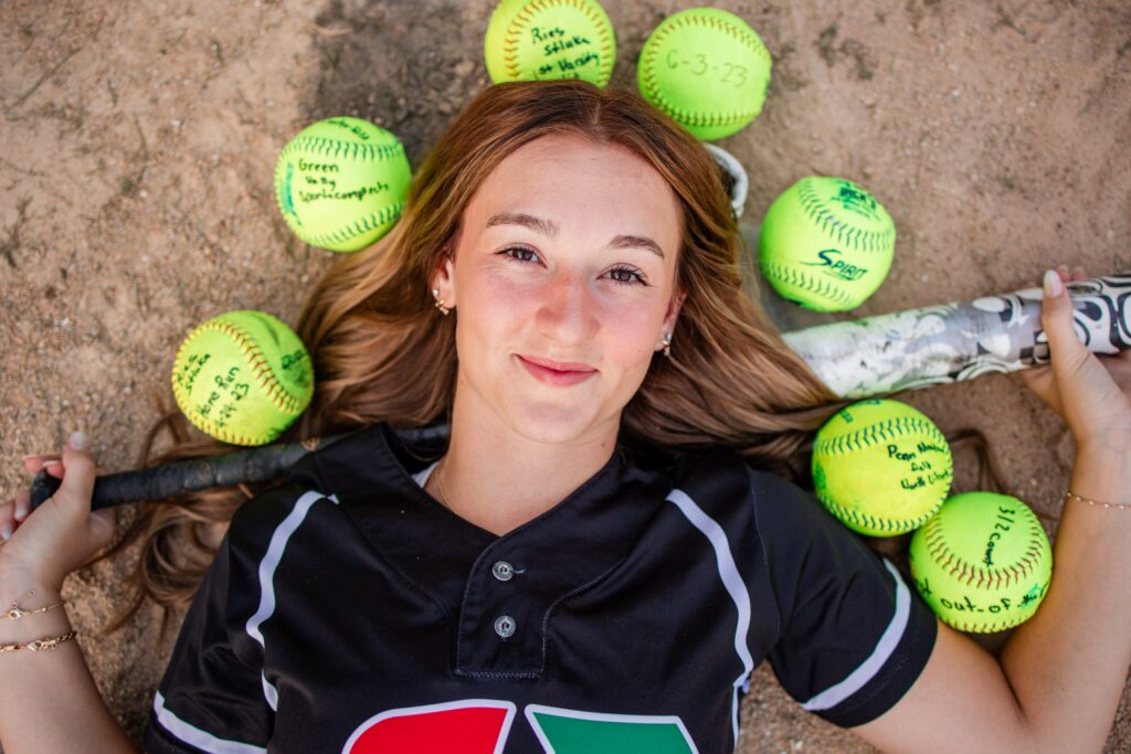 And then the softball field. She showed up with everything. Trophies, medals, bats, softballs, gloves, gear from her travel team. Every single piece had been earned. That portion of the session wasn’t about props — it was about proof. Proof of seasons spent, skills built, a sport she’s genuinely poured herself into.
